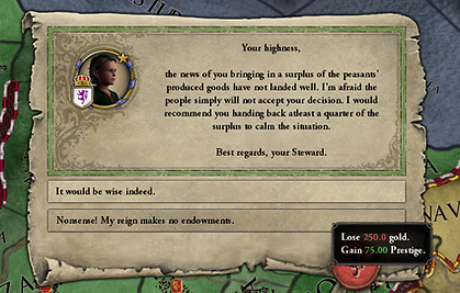 I scripted an event mod for Crusader Kings II consisting of short narrative segments which affect players' level of wealth and prestige.